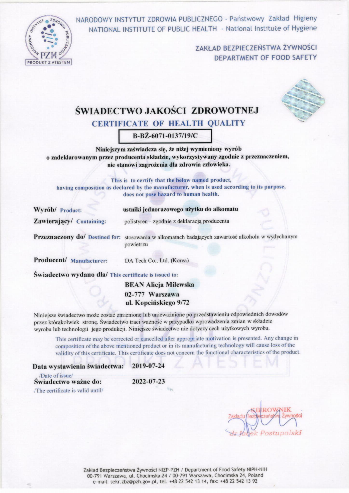 - Kartę gwarancyjną + certyfikat kalibracji alkomatu