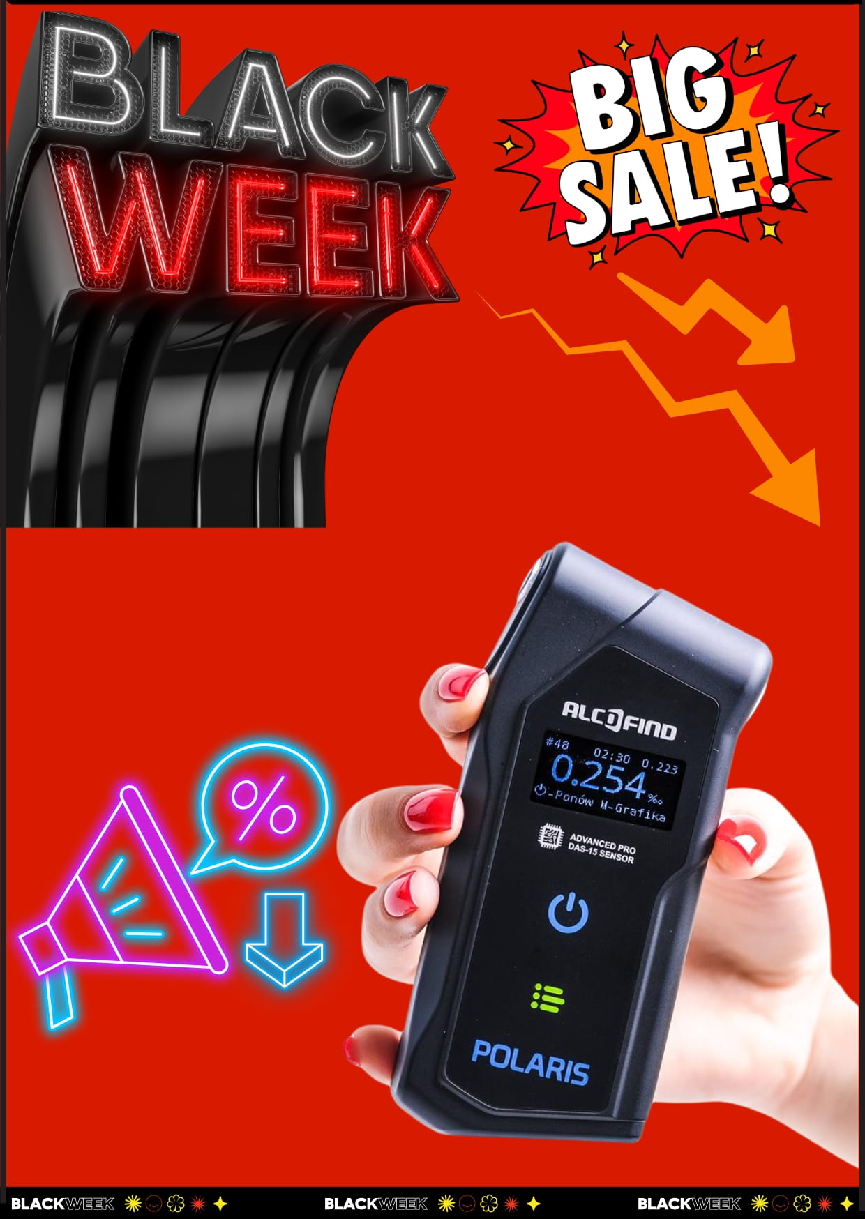 W ramach BLACK WEEK możesz teraz kupić Alkomat Alcofind Polaris w atrakcyjnej cenie, więc nie zwlekaj z decyzją! To idealna okazja, aby zadbać o swoje bezpieczeństwo i bezpieczeństwo innych na drodze.
