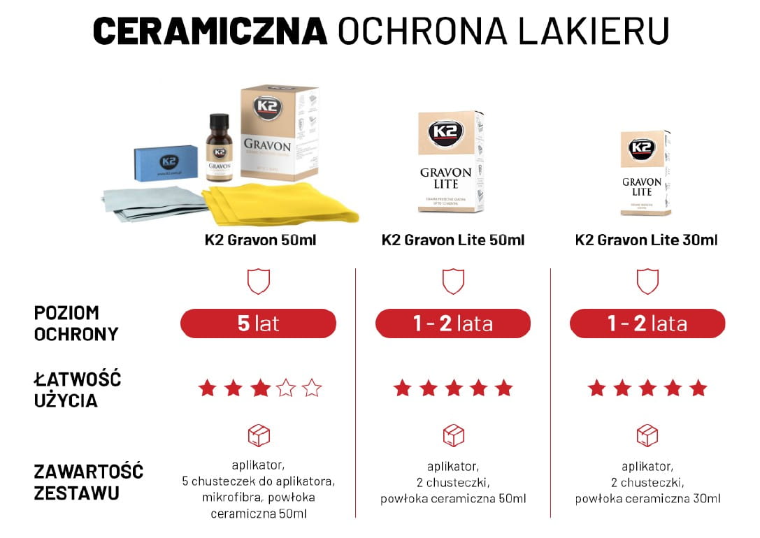 Bazując na najnowocześniejszej technologii, stworzyliśmy produkt dla najbardziej wymagających entuzjastów motoryzacji, zapewniający 100% satysfakcji z finalnego efektu. Powłoka K2 GRAVON to jeden z najbardziej innowacyjnych produktów w naszej ofercie, oparty na nanotechnologii, zaprojektowany bezkompromisowo dla osiągnięcia najlepszego rezultatu.