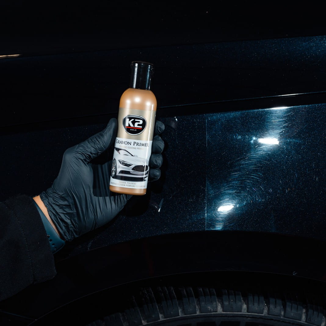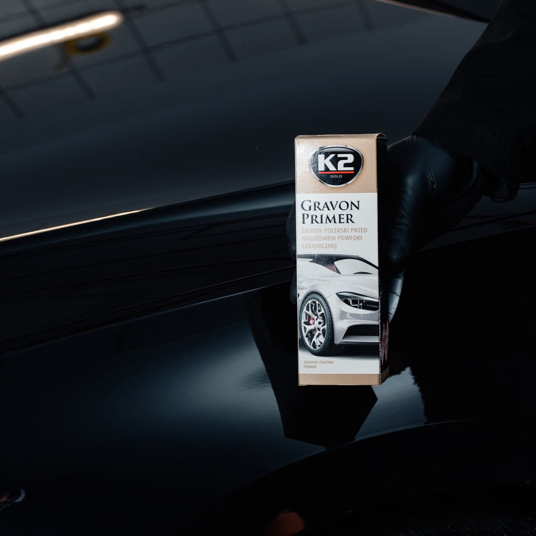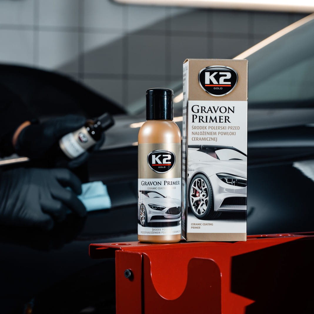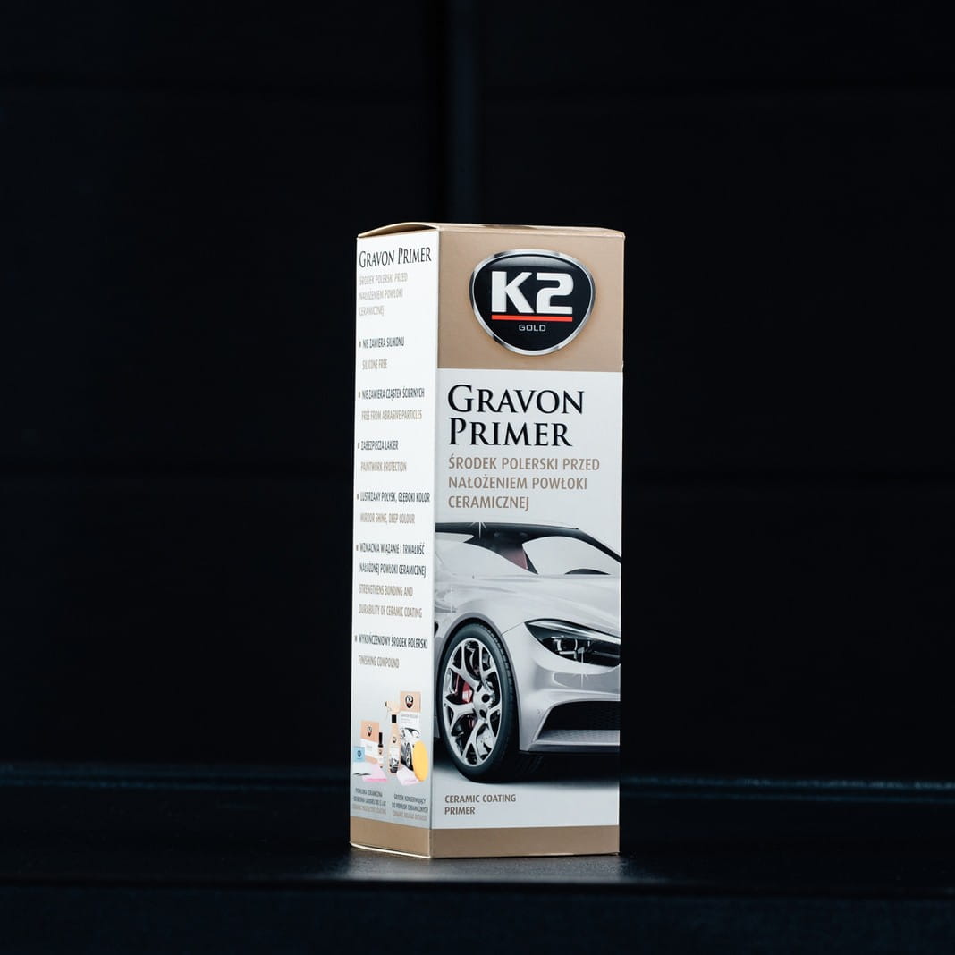 K2 Gravon Primer to podkład polerski stosowany bezpośrednio na lakier przed aplikacją powłoki ceramicznej K2 Gravon (oraz innych powłok ceramicznych i kwarcowych). Bardzo mocno podbija głębię koloru lakieru i zwiększa połysk. Wzmacnia wiązanie i trwałość nałożonej na niego powłoki ceramicznej. Nie zawiera cząstek silikonu oraz cząstek ściernych. Nadaje się również jako wykończeniowy środek polerski przy korekcie lakieru.