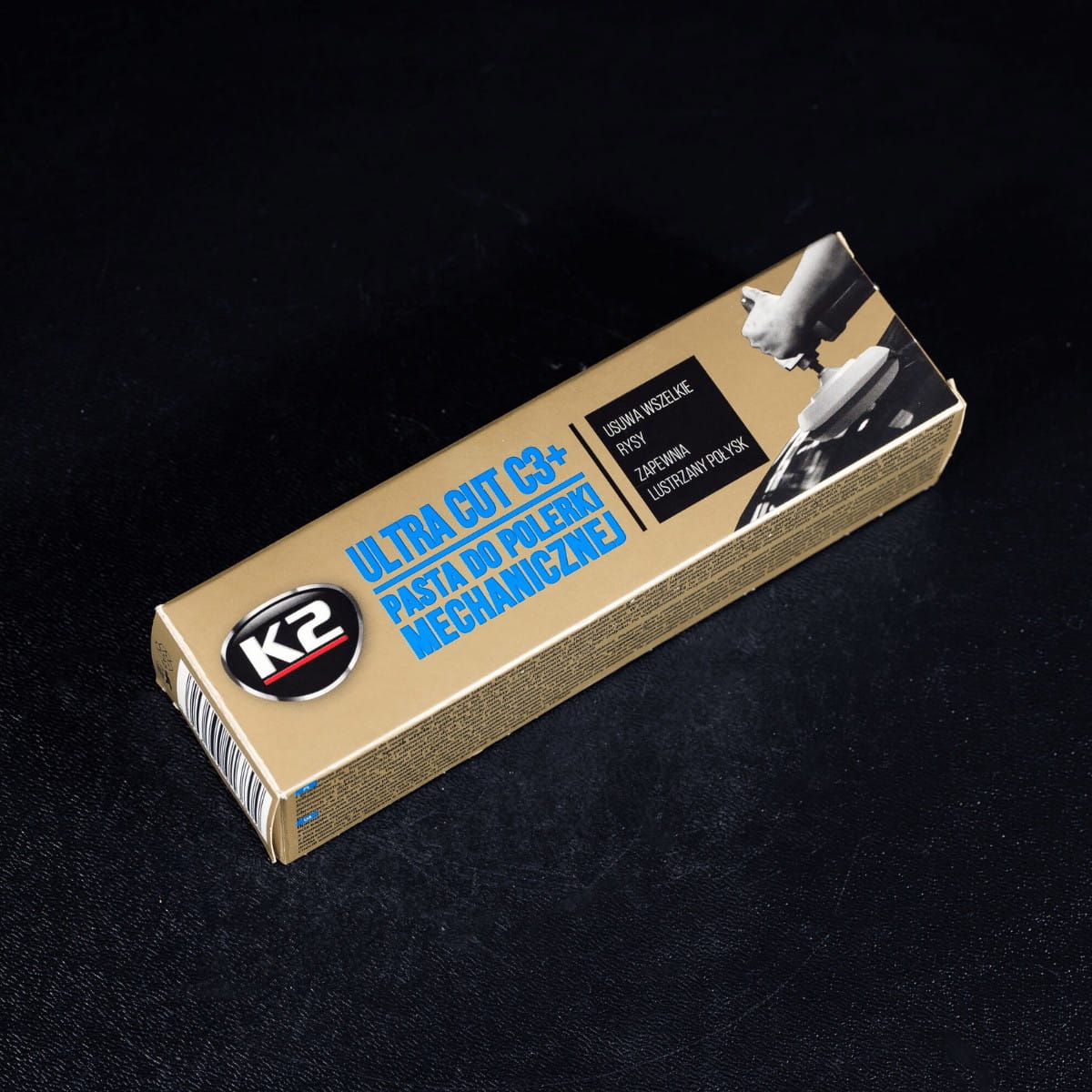 K2 ULTRA CUT C3+ to pasta do maszynowego polerowania lakieru. Usuwa bardzo duże rysy nawet po papierze gradacji 800 i daje perfekcyjny efekt końcowy o wysokim połysku. Eliminuje wszelkie defekty, skórkę pomarańczową, zacieki, oksydację, rysy i hologramy, przebarwienia. Pozwala zaoszczędzić czas, ponieważ w odróżnieniu od wielu produktów charakteryzuje się wysoką szybkością działania. Nadaje się do polerowania lakierów samochodowych wszelkiego rodzaju, lakierów przemysłowych, łodzi, mebli, żelkotów, reflektorów, celulozy, powierzchni syntetycznych, akryli i wielu innych.