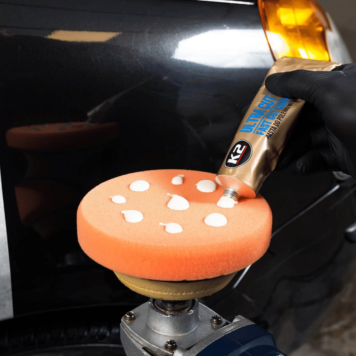 Pasta K2 ULTRA CUT C3+ nadaje się do użycia z różnej twardości gąbkami polerskimi. Do usuwania niewielkich zarysowań zaleca się używanie gąbki lekkościernej (np. K2 DURAFLEX L613, L643). Usuwając bardzo poważne defekty należy stosować gąbkę mocnościerną (np. K2 DURAFLEX L611, L641) lub gąbkę średniościerną (np. K2 DURAFLEX L612, L642). Chcąc uzyskać perfekcyjny efekt wykończeniowy na bardzo zniszczonych powierzchniach, zaleca się użcie pasty w dwóch krokach: początkowo z gąbką twardą - usuwanie rys, następnie z gąbką miękką lekkościerną - nabłyszczanie.