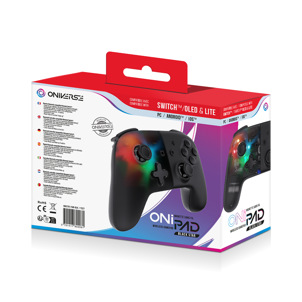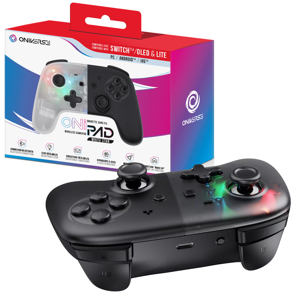Oniverse OniPad to bezprzewodowy kontroler, który zapewnia płynną grę bez opóźnień dzięki szybkiemu połączeniu Bluetooth. Ergonomiczna konstrukcja gwarantuje wygodny chwyt nawet podczas długich sesji, a konfigurowalne diody LED pozwalają na personalizację kontrolera.