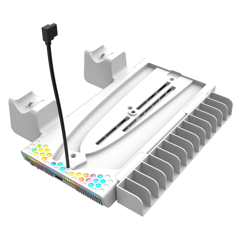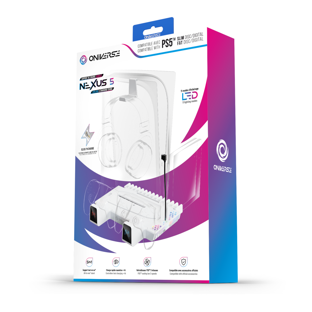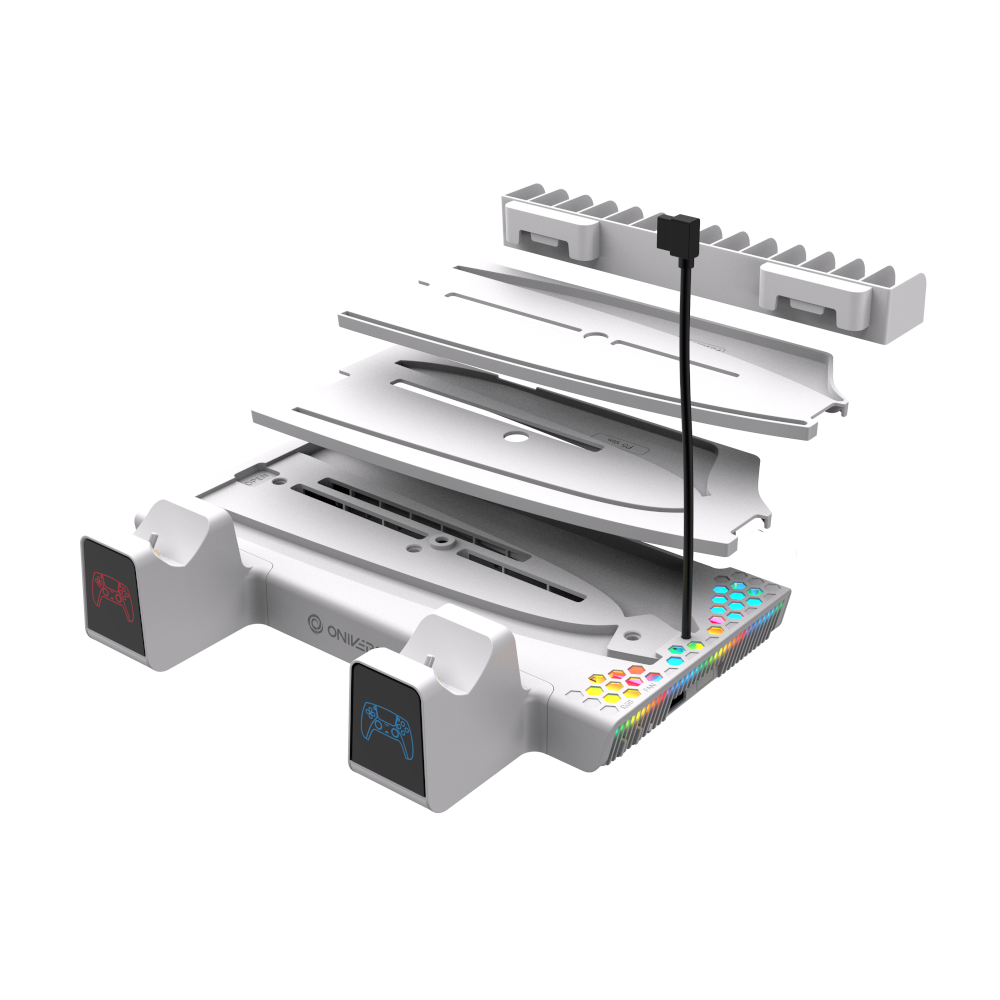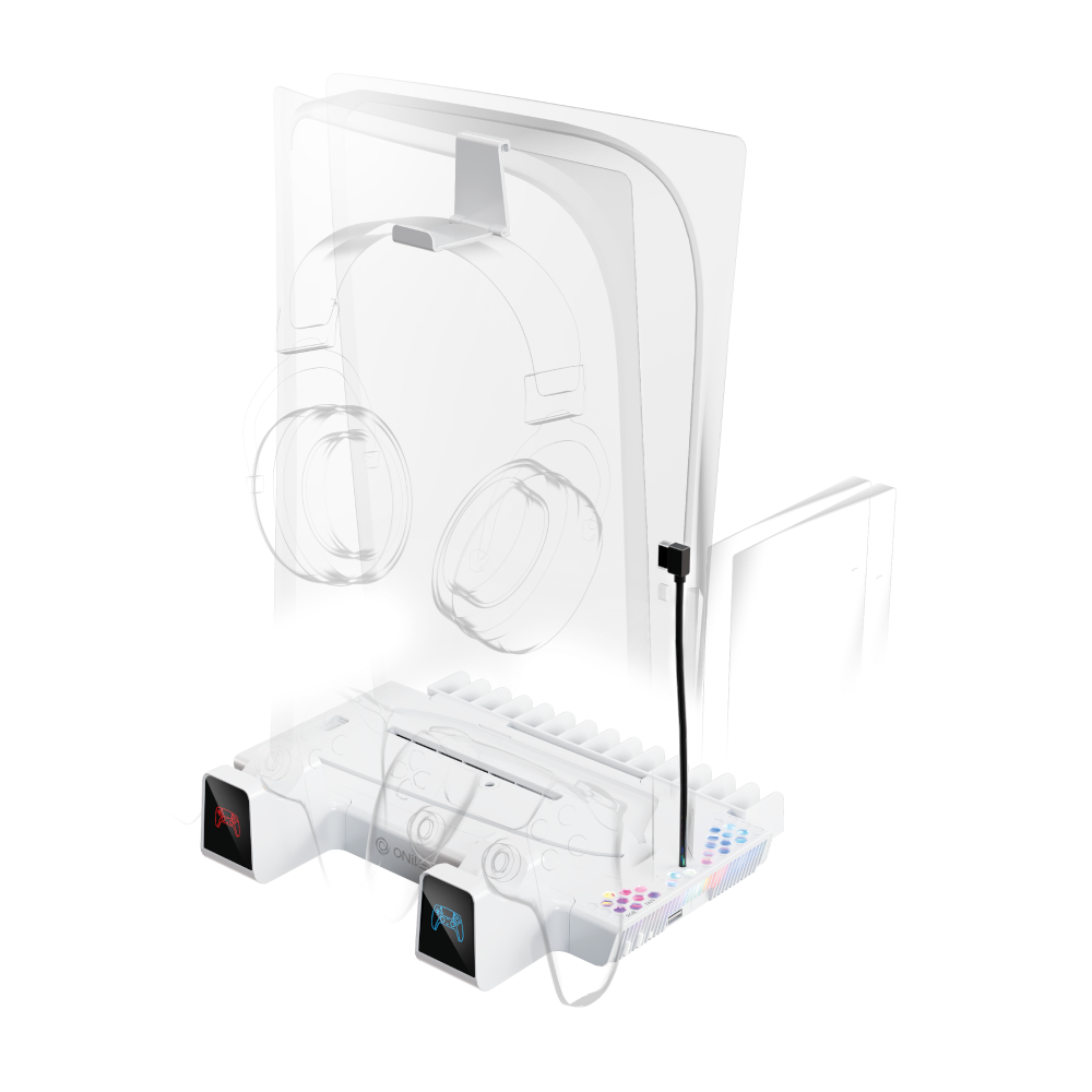 Oniverse Nexus 5 to wszechstronna podstawka zaprojektowana z myślą o konsolach PS5. Łączy funkcje chłodzenia, ładowania kontrolerów oraz organizacji akcesoriów, umożliwiając wygodne przechowywanie gier i słuchawek.