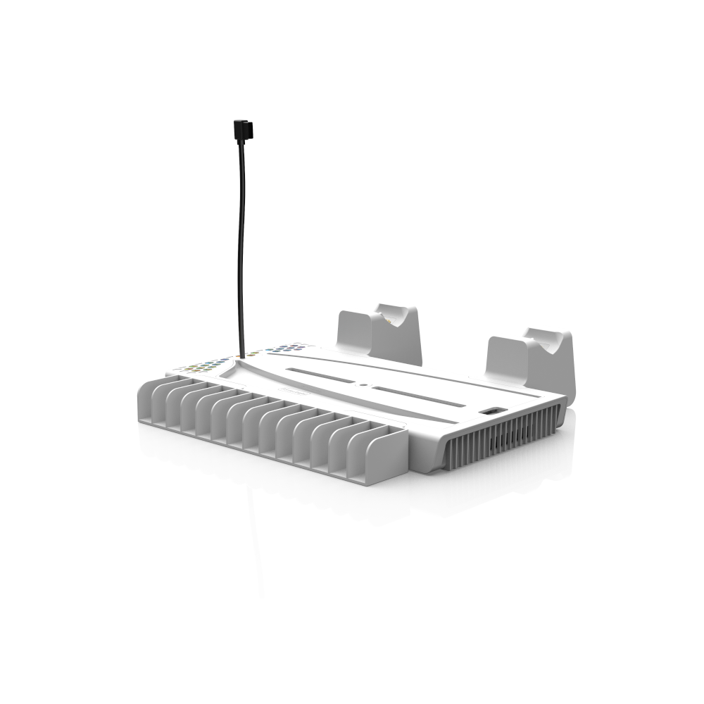 - Wskaźniki LED – diody informują o stanie ładowania kontrolerów (czerwona – ładowanie, niebieska – pełne naładowanie).