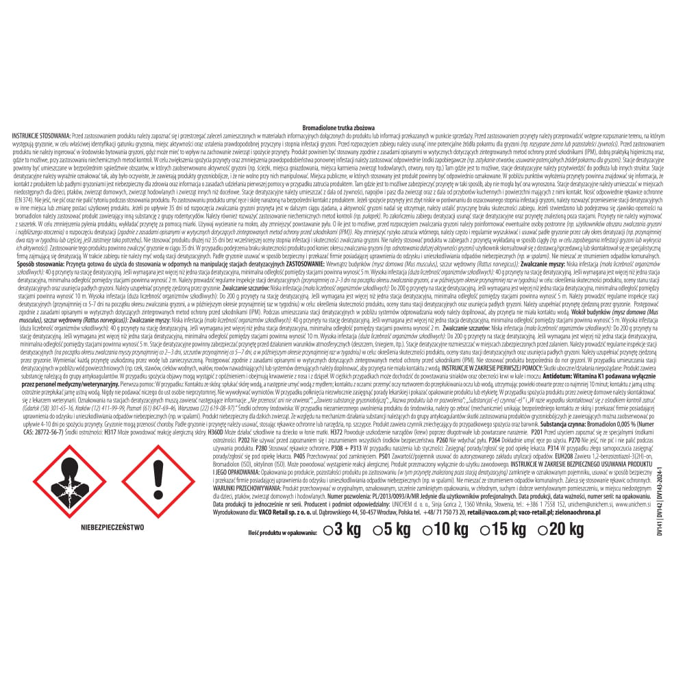 Ziarno VACO PROFESSIONAL to gwarancja pełnej skuteczności w walce z gryzoniami. Formuła trutki zawiera Bromadiolon o stężeniu 50 ppm, co czyni ją niezwykle efektywną nawet przy jednorazowym kontakcie. Niezależnie od tego, czy masz do czynienia z myszami, szczurami wędrownymi, czy szczurami śniadymi, nasz produkt szybko i skutecznie pozbędzie się szkodników z Twojego otoczenia. Produkt ten doskonale sprawdza się zarówno w miejscach domowych, jak i w przestrzeniach przemysłowych.