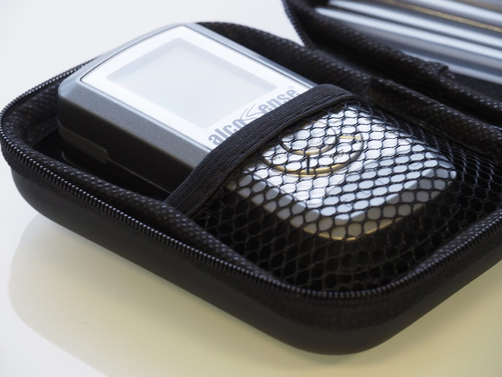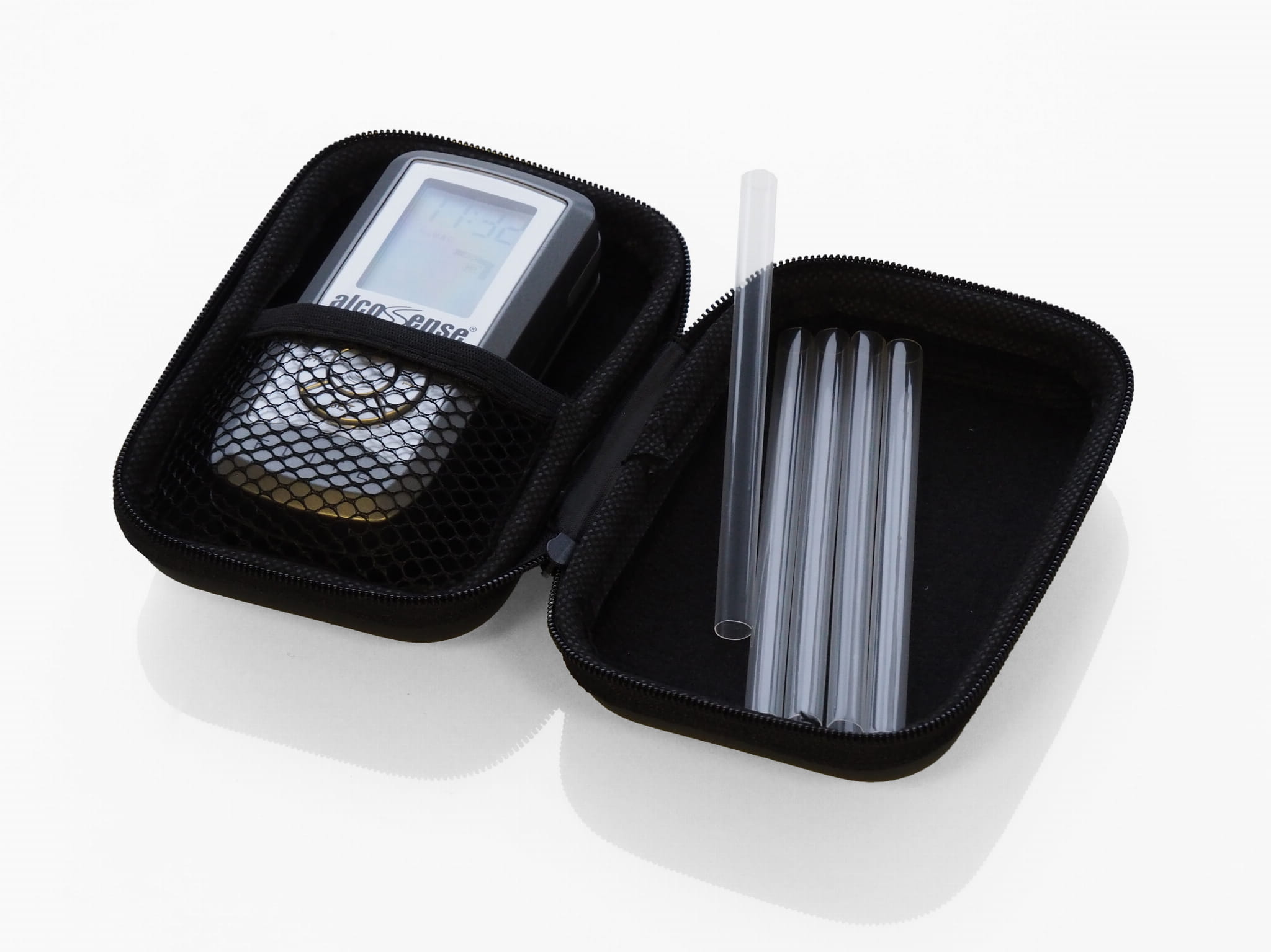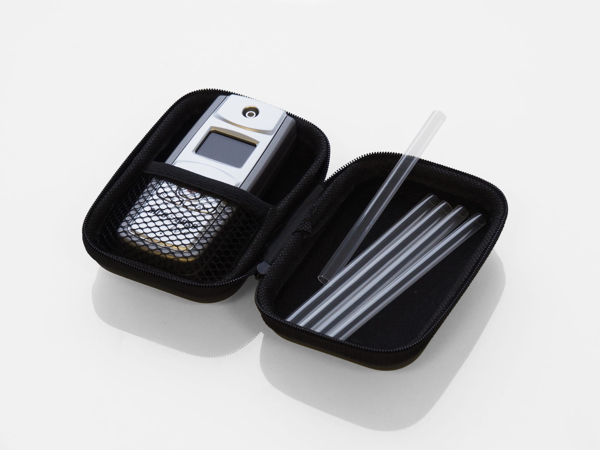 Futerał jest wykonany z wytrzymałego, twardego materiału a wnętrze posiada miękkie wykończenie. Wewnątrz posiada siatkową kieszonkę oraz zamek aby utrzymać alkomat w czystości.