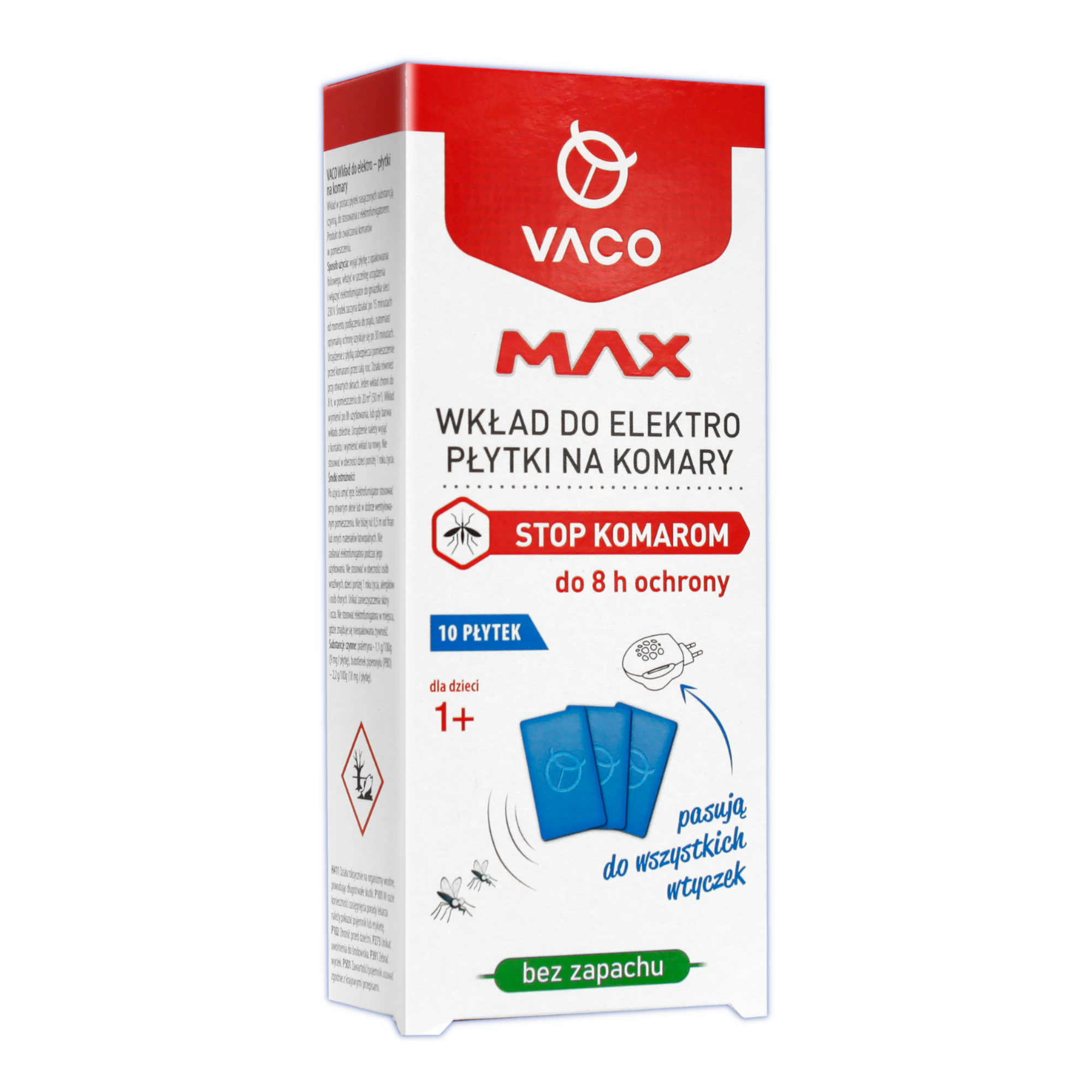 Bezzapachowe wkłady (płytki) wymienne do elektrofumigatora VACO, przeznaczone do ochrony pomieszczeń przed komarami. Opakowanie zawiera 10 sztuk płytek, które po podłączeniu urządzenia do prądu uwalniają substancję zwalczającą owady. Działają skutecznie nawet przy otwartym oknie i zapalonym świetle. Wkłady VACO pasują do urządzeń przystosowanych do płytek dostępnych na rynku.