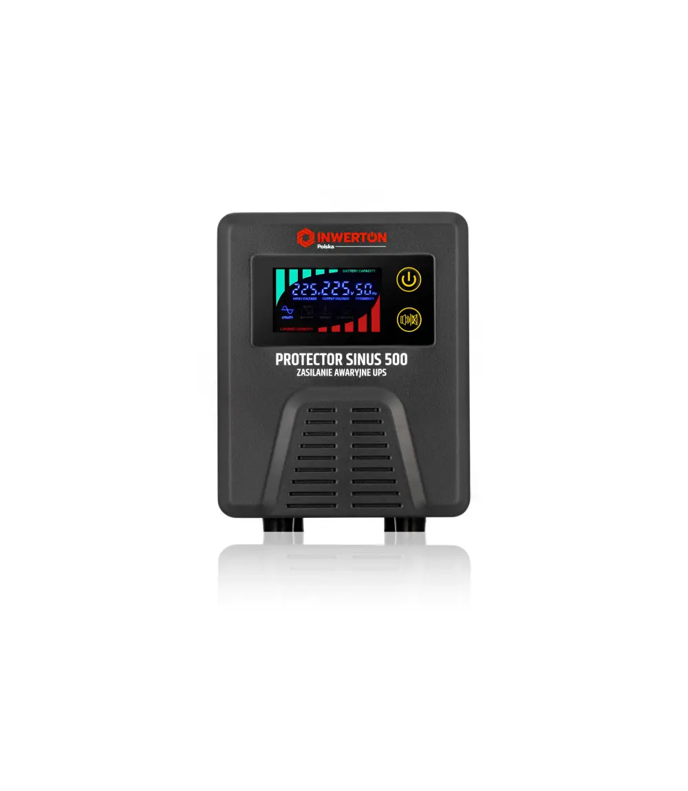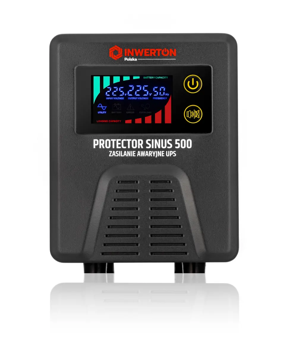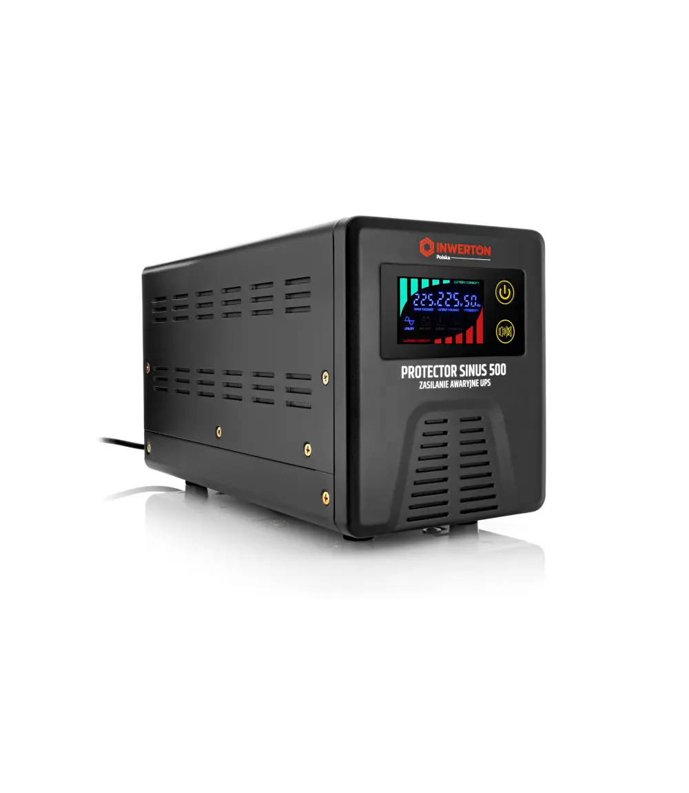 UPS Inwerton Protector Sinus 500 – zasilacz awaryjny typu line-interactive, generujący czystą falę sinusoidalną, idealną do zasilania urządzeń indukcyjnych, takich jak pompy, silniki czy piece.